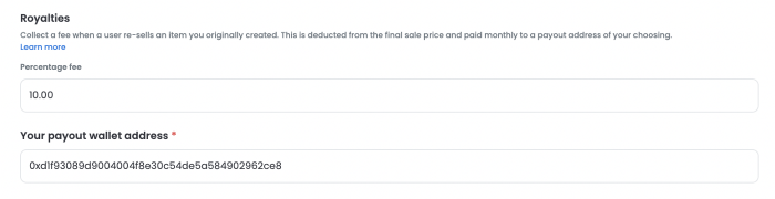 前往 Opensea 收款管理器,將群組地址複製並粘貼到 Opensea 版稅設置字段中,並設置該群組將收到的金額(最高為銷售收入的 10%)。 然後 Opensea 將繼續將所有未來銷售的版稅發送到該地址: